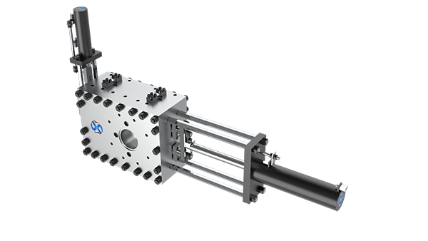 將板式換網器吊裝到機筒法蘭與模具法蘭中間,注意要分清進口和出口,進口方向滑板上的多孔板可以取下,出口方向多孔板是取不下來的,出口方向換網器主體上有個蓋板很容易分清,如果方向裝反要重新安裝。